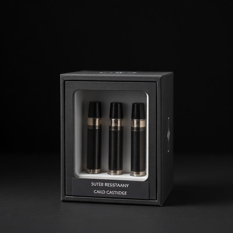Premium rigid cuboid box with child-resistant mechanism for vape cartridges. Magnetic closure combined with CR safety feature.